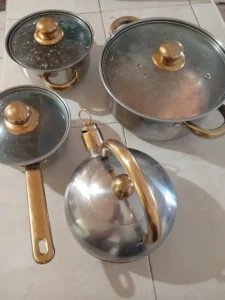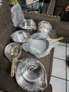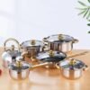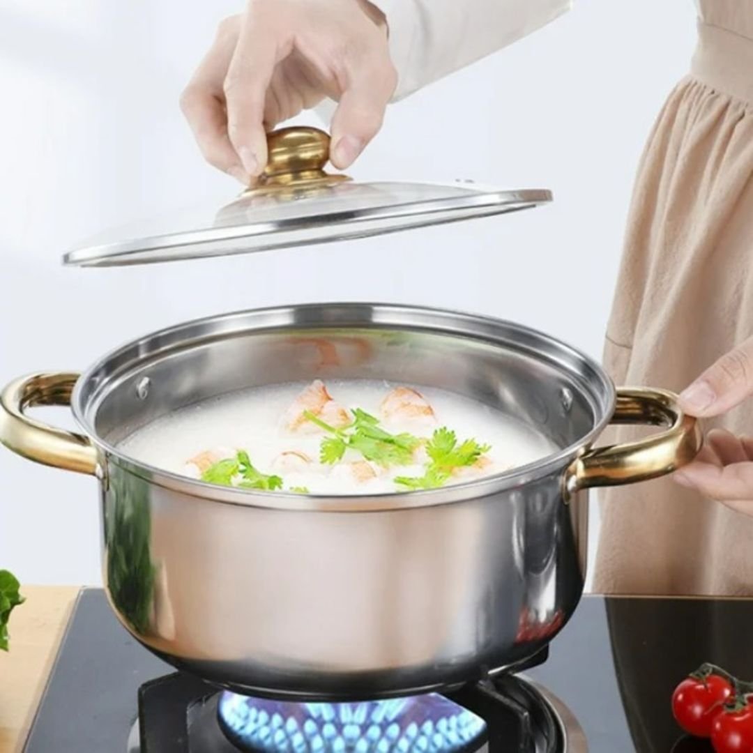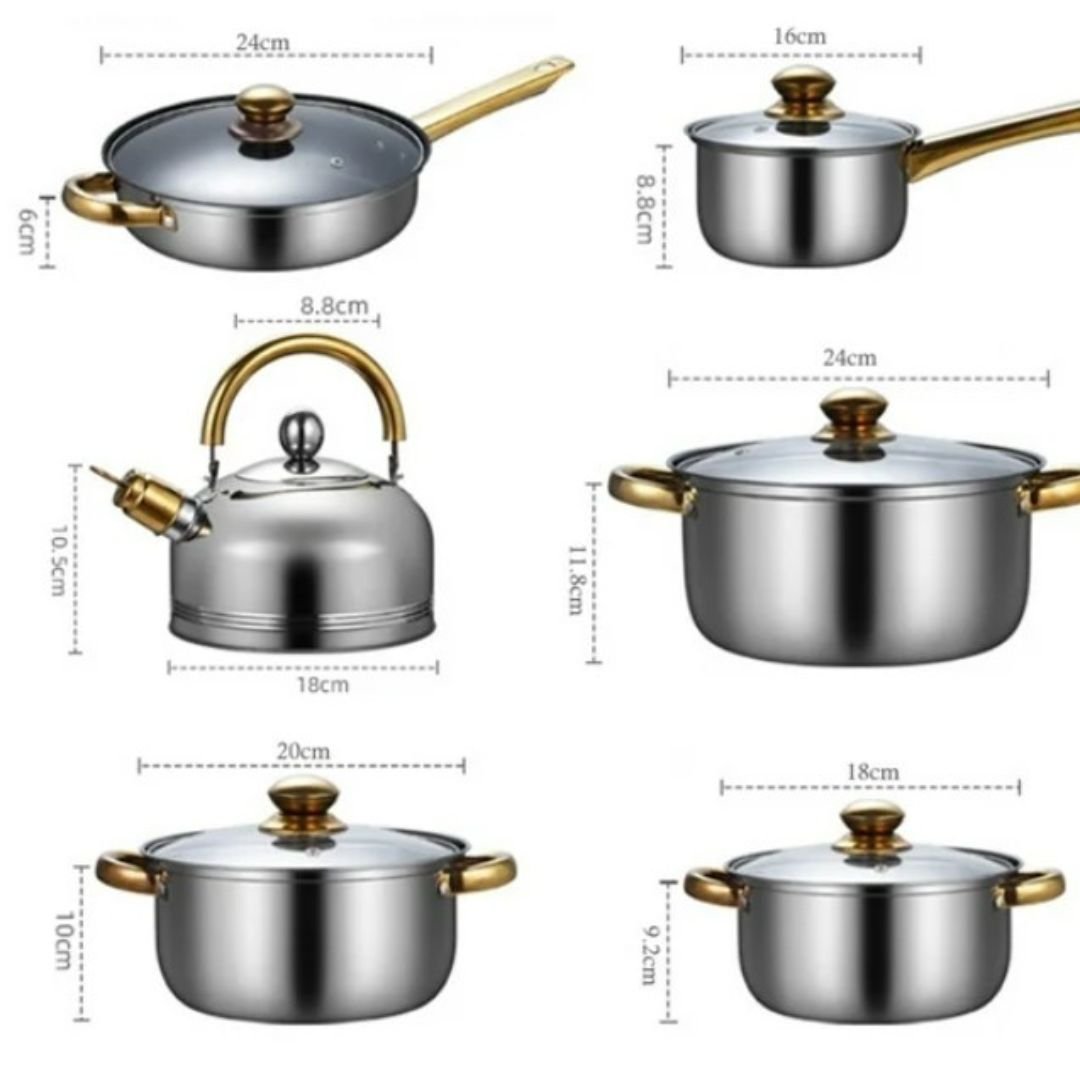 Este elegante set de cocina está diseñado para brindar durabilidad, estilo y funcionalidad a cualquier hogar. Fabricado en acero inoxidable resistente, cada pieza ofrece una excelente distribución del calor y un acabado brillante que realza la presentación en la cocina. Los mangos y perillas en tono dorado aportan un toque de lujo, mientras que las tapas de vidrio templado permiten supervisar la cocción sin perder vapor. Compatible con todo tipo de estufas (inducción, gas, eléctrica), duradero y fácil de limpiar.