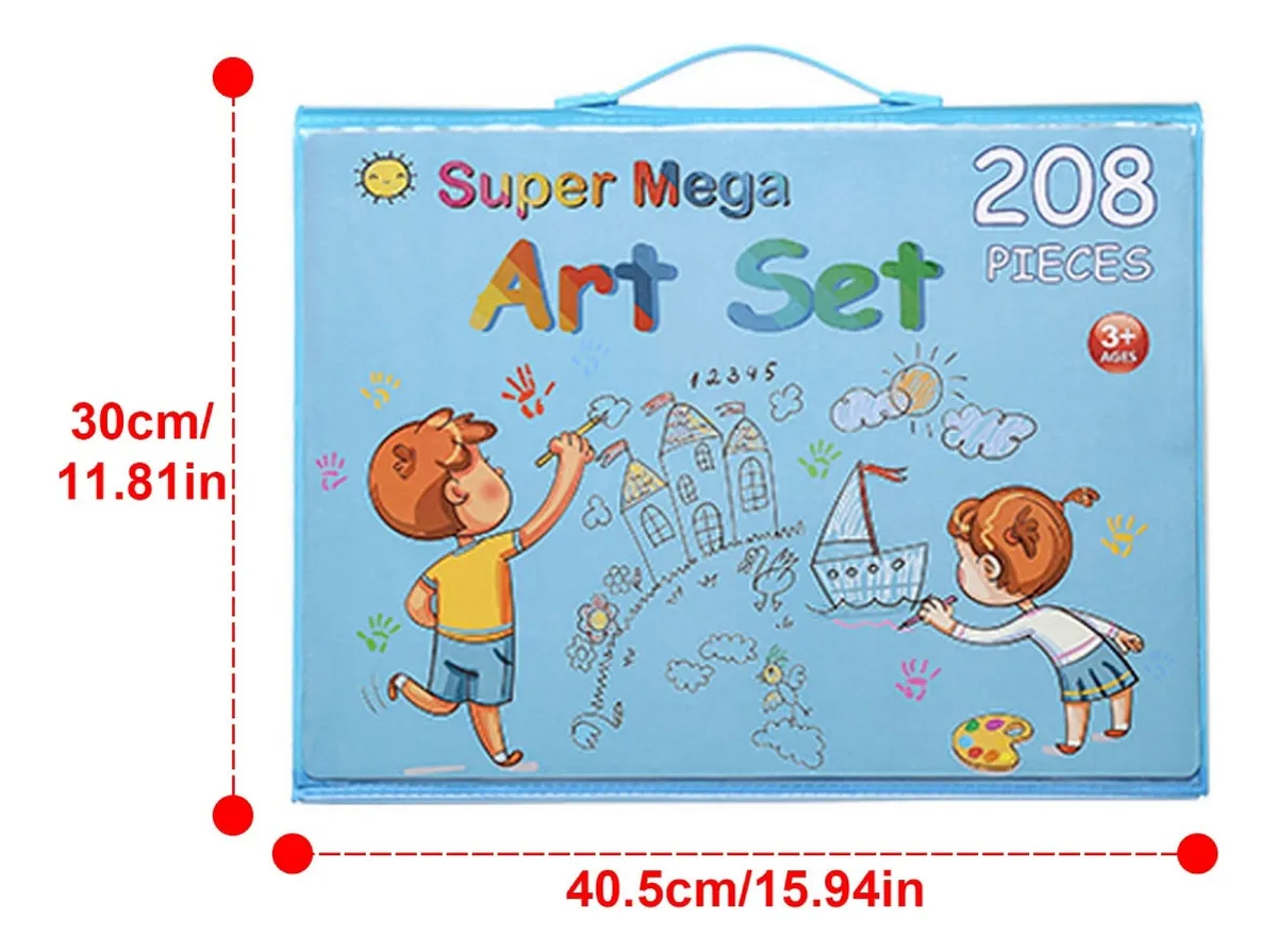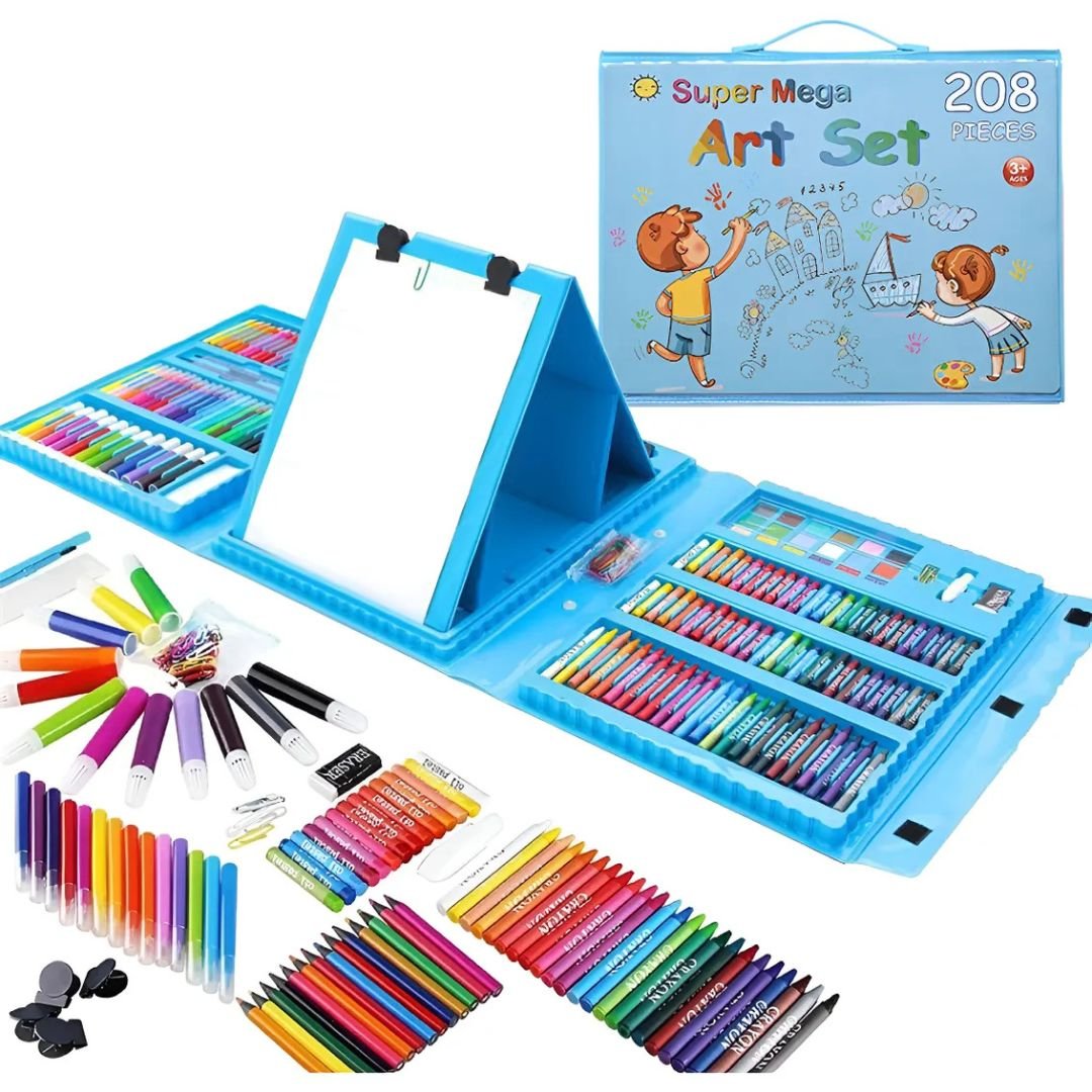Cantidad total: 208 piezas organizadas en una práctica maleta. Incluye: crayones, plumones, lápices de colores, acuarelas, pinceles, regla, goma de borrar, sacapuntas y hojas de dibujo. Materiales: pigmentos no tóxicos, seguros para uso infantil, resistentes y de colores intensos. Maletín: fabricado en plástico resistente con compartimentos internos, liviano y fácil de transportar. Edad recomendada: a partir de 3 años. Usos ideales: dibujo, pintura, trabajos escolares, proyectos artísticos, clases o diversión en casa.