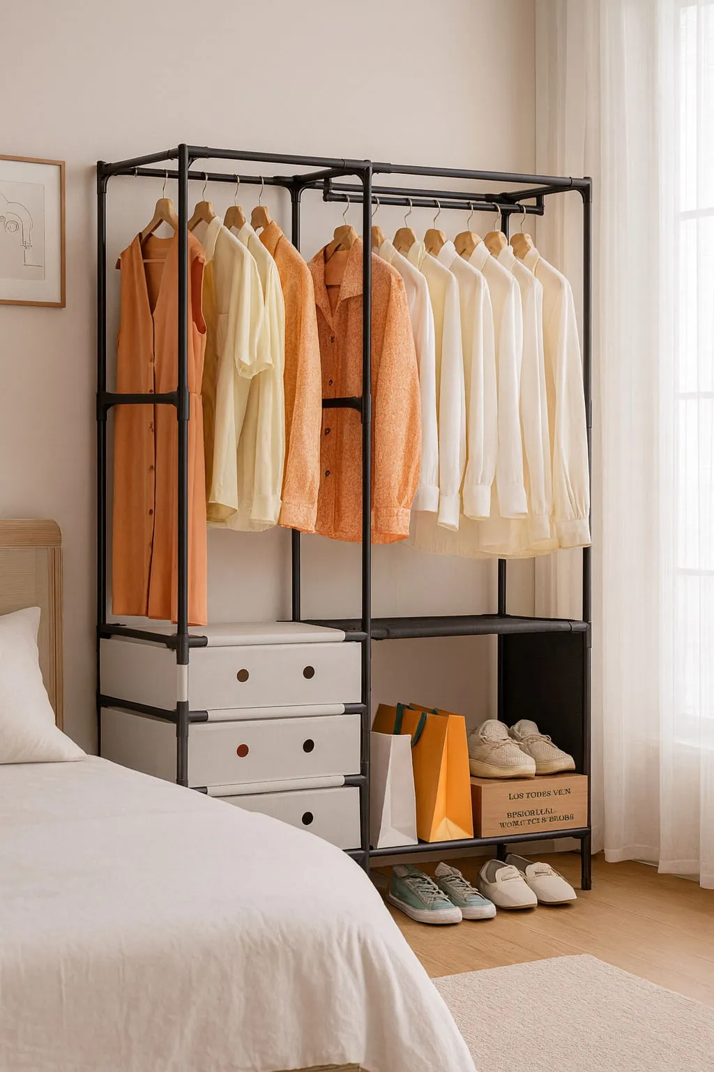 Llegar a casa y encontrar tu ropa desordenada, arrugada o sin un lugar adecuado genera estrés y sensación de caos. Este perchero tipo clóset de lujo está diseñado para devolverte la tranquilidad, ayudándote a mantener cada prenda visible, organizada y siempre lista para usar. Su diseño elegante no solo optimiza el espacio, sino que también eleva la estética de tu habitación, haciendo que el orden se sienta natural y agradable.